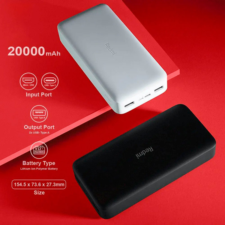 نوع باتری پاوربانک لیتیوم پلیمیری ۲۰۰۰۰ میلی آمپر ساعتی با قابلیت شارژ مجدد از طریق درگاه های ورودی Type-C و Micro USB روی بدنه