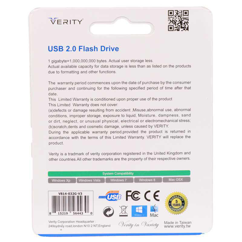 فلش وریتی VERITY V814 32GB یک فلش مموری با کیفیت مناسب از شرکت وریتی است. این فلش مموری با ظرفیت ۳۲ خود قابلیت ذخیره سازی بیشتر از ۲۰۰۰ آهنگ با کیفیت را دارد، همچنین اگر جزو آن دسته از افراد هستید که عاشق تماشای فیلم ها و سریال های روز دنیا هستید، می توانید چیزی بیش از ۱۵ فیلم را با کیفیت مناسب درون این فلش مموری جای دهید. به علاوه با پیشرفت تکنولوژی و به بازار آمدن فلش مموری های با ظرفیت بالاتر دیگر فلش های ۸ گیگ و پایین تر صرفه اقتصادی ندارند و اختلاف قیمت بسیار کمی با نوع ۳۲ گیگی خود دارند، به همین دلیل تهیه یک فلش مموری ۳۲ گیگی مانند فلش وریتی VERITY V815 32GB یک گزینه اقتصادی و به صرفه به نظر می رسد. فلش وریتی VERITY V814 32GB با بدنه فلزی خود در برابر بسیاری از ضربه ها مقاوم است، به همین دلیل می تواند یک همراه خود در فضاهای باز و آزاد برای شما باشد. همچنین این فلش مموری دارای یک سری USB 2.0 است که اطلاعات را باسرعت مناسبی انتقال می دهد. این سری ها، رابط های معمول در بسیاری از فلش مموری ها با ظزفیت های گوناگون هستند که به شما سرعتی مطلوب را ارئه می دهد. فلش وریتی VERITY V814 32GB همچنین دارای یک بند متصل به انتهای بدنه خود است که می توانید با استفاده از این بند، از گم شدن آن جلوگیری کنید. لازم به ذکر است که این فلش مموری دارای ابعاد کوچک و بسیار قابل حملی است که علاوه بر اشغال جای بسیار کم در زمانی که درون پورت هم هست به دلیل اینکه بیشتر بدنه آن وارد پورت شده، احتمال خم شدن و یا شکستن آن به حداقل می رسد. این فلش مموری با گارانتی مادام العمر شرکت آسان سرویس(شرکت بازرگانی صبا) عرضه می شود.